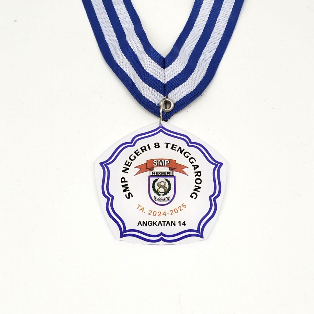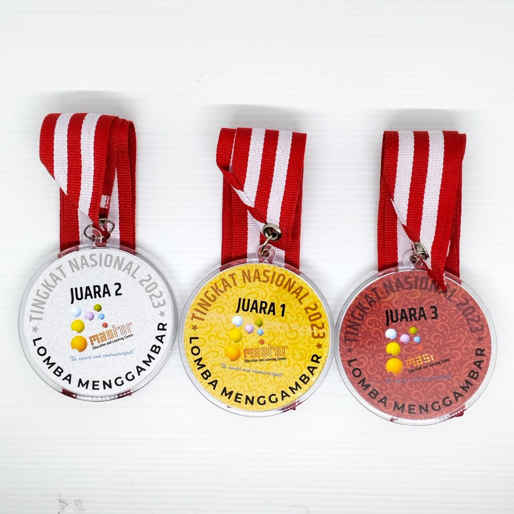Terbuat dari bahan akrilik bening berkualitas tinggi yang ringan dan jernih, medali ini menampilkan cetakan presisi yang tajam. Dilengkapi dengan pita gantung custom bermotif garis biru dan putih yang serasi, medali ini menjadi simbol prestasi yang membanggakan bagi tim juara. Sangat ideal untuk penghargaan kompetisi internal maupun turnamen antar instansi.